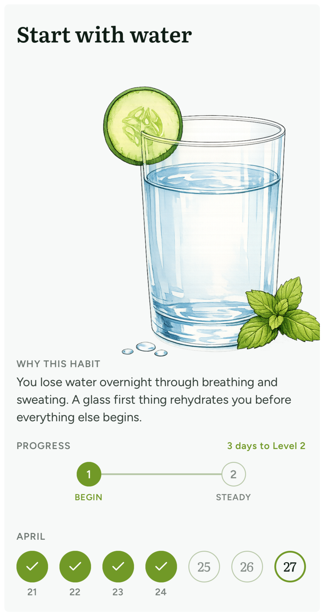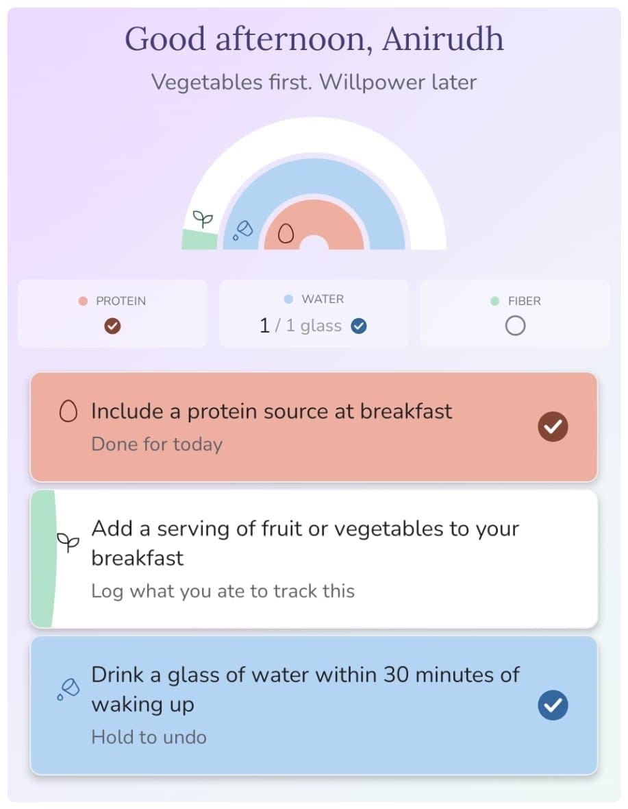 Starts small and builds. The first habit might be drinking a glass of water when you wake up. Or adding a protein source to one meal. These are small on purpose. The system graduates you through habits over time, building from foundations rather than asking you to overhaul your eating overnight.