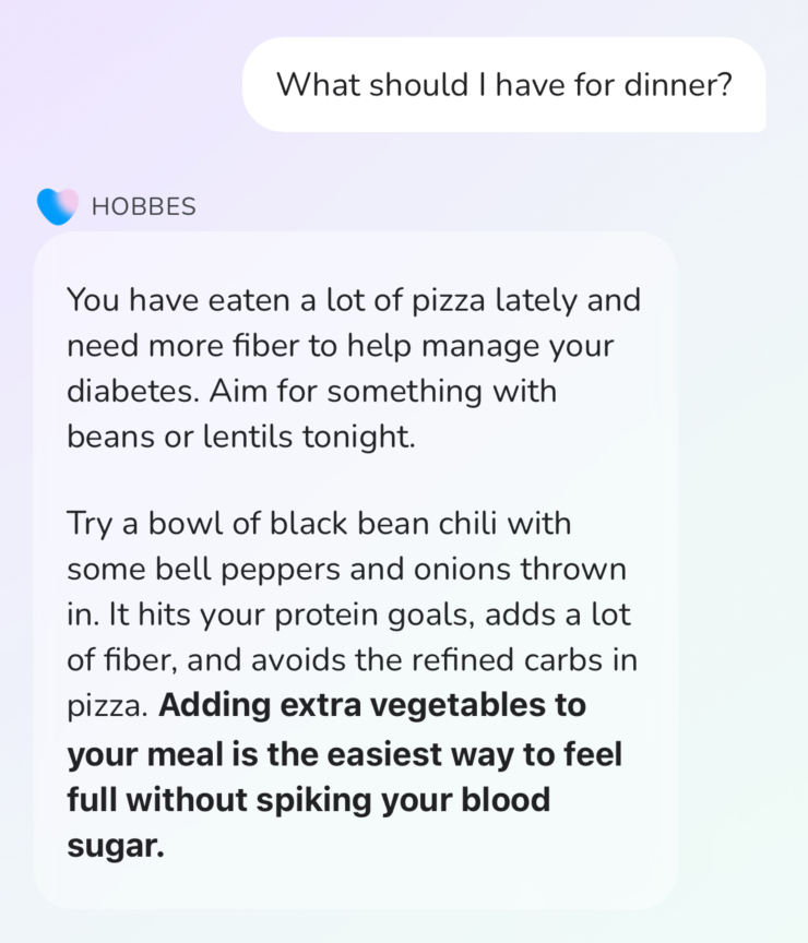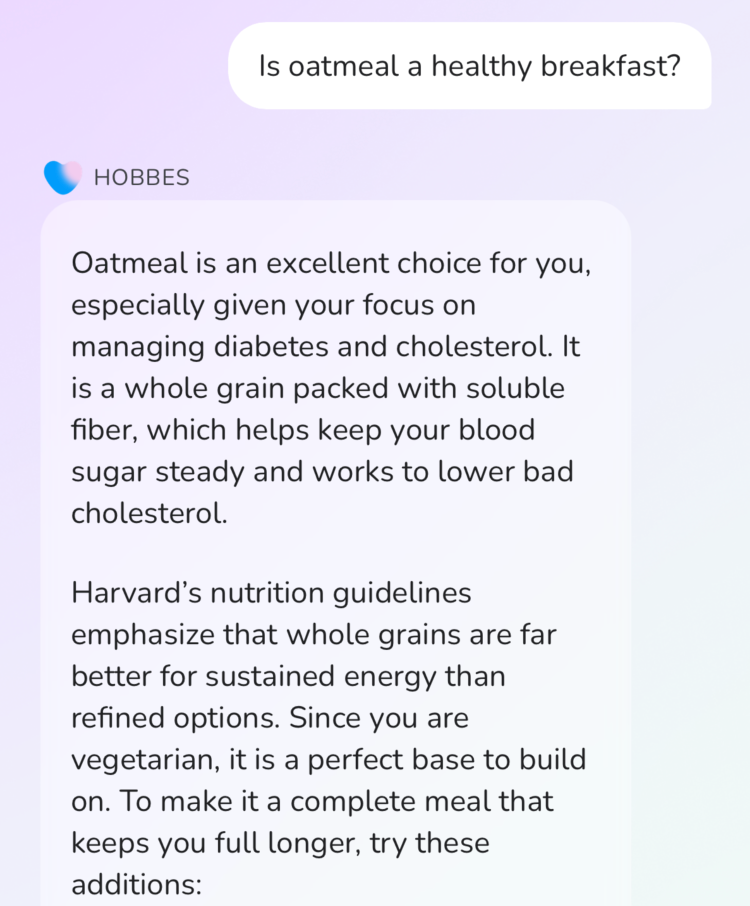 Hobbes can do both because your meals, your goals, and your health context all live in the same place. So when you ask "what should I eat for dinner tonight?" the answer takes into account what you have already eaten today, what your nutrition targets look like, and what you actually enjoy eating. When you ask "how much protein do I really need?" the answer is grounded in your specific goals and conditions, not a generic recommendation.