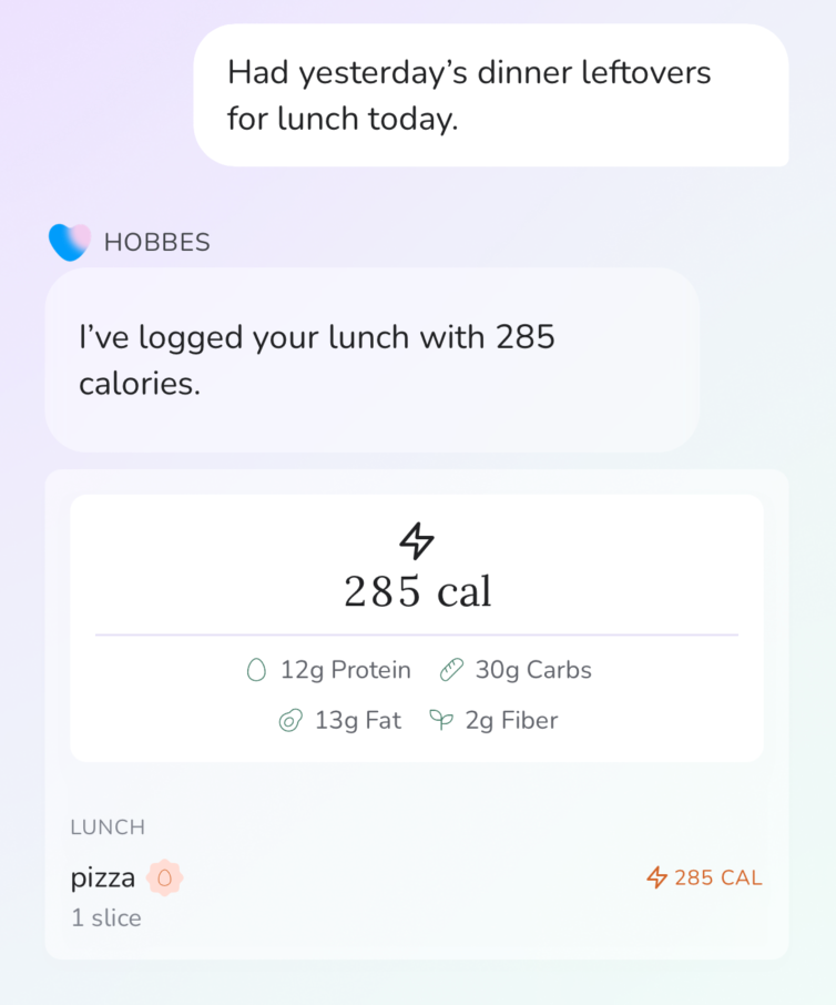 Hobbes understands how people actually talk about food. In real life, nobody describes every meal from scratch. We rely on memory, context, and shorthand. We say things like: "Same as yesterday's breakfast", "My usual breakfast", "Dinner leftovers for lunch", "Same as yesterday's breakfast, but non-fat Greek yogurt instead of regular yogurt", "I skipped lunch", "Actually, that was for lunch".