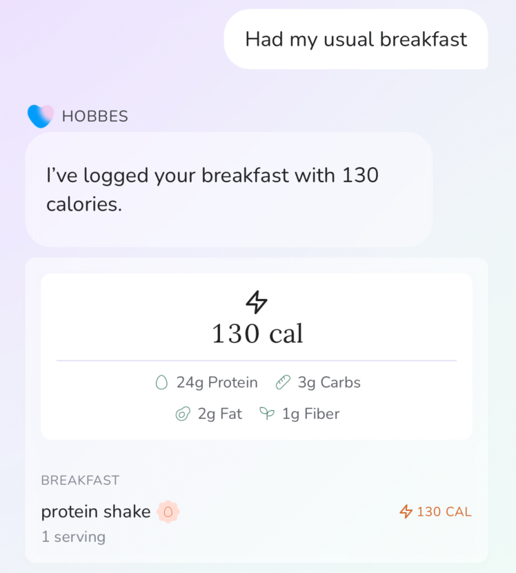 I did not want to rely solely on an AI model to estimate calories and macros. Behind the chat interface, Hobbes maps what you say to trusted nutrition databases. You get real calorie and macro data, not just an LLM's best guess. The conversation is the interface. It is not the entire system.
